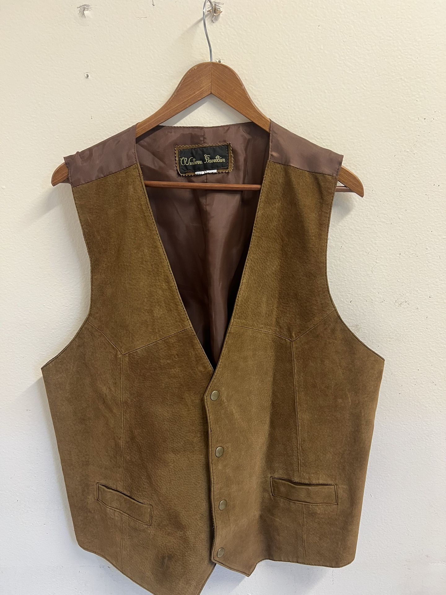 Brown suede vest with polyester (I think) back. Vest is adjustable and in size large