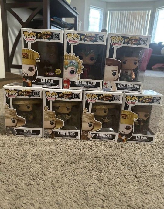 Never unboxed collectible Funko Pop - Big Trouble In Little China 7pc set. Includes: 151 Jack Burton, 152 Gracie Law, 153 Lo Pan, 153 Lo Pan (Glows in the Dark), 154 Rain, 155 Thunder and 156 Lighting. $600 value.