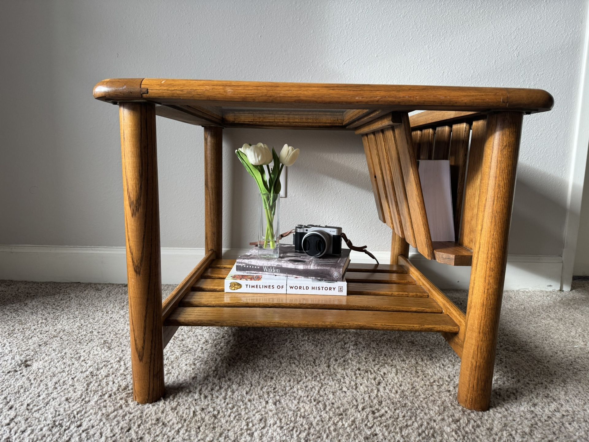 Solid wood table with a removable glass inset top and built-in magazine/book rack. Well-constructed, sturdy piece with classic Craftsman/Mission-style design and a lower slatted shelf for storage or display. The wood is in very good condition with attractive grain and normal age-related wear. The glass top has visible surface scratches (cosmetic only; no cracks or chips). Glass lifts out easily, allowing use without glass or replacement if desired. Great as: • Side table or end table • Compact coffee table • Reading nook or living room accent Approximate dimensions: • Length: 26 in • Width: 26 in • Height: 20 in Details: • Solid wood construction (not veneer/MDF) • Removable glass inset top (scratched, cosmetic wear) • Integrated magazine/book rack • Lower storage shelf • Structurally solid and stable