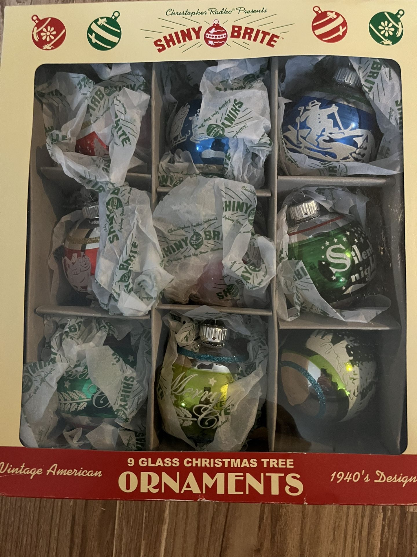 This is a set of Christopher Radko Presents Shiny Brite 9 Glass Christmas Tree Ornaments. The ornaments are a vintage American 1940s design. The Shiny Brite line features recreations of popular 1940s and 1950s American ornaments. Each ornament is crafted from mouth-blown glass and hand-painted with intricate details using old-world techniques.