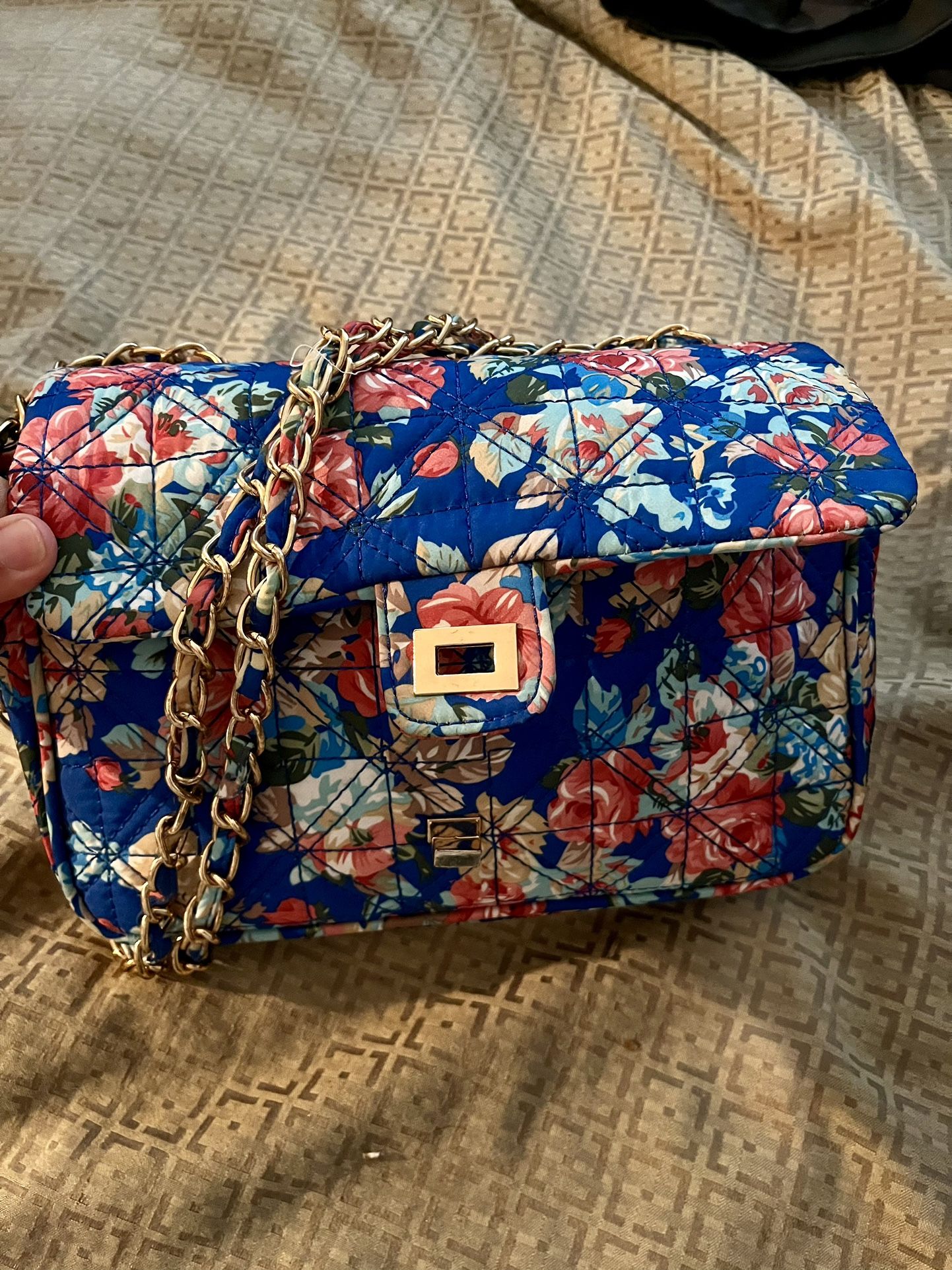 Blue, Flower Quilted Sling Bag Featuring Fabric Flower Details with Flap and Twist Lock Closure. Gold Metal Shoulder Chain. In very good condition pop