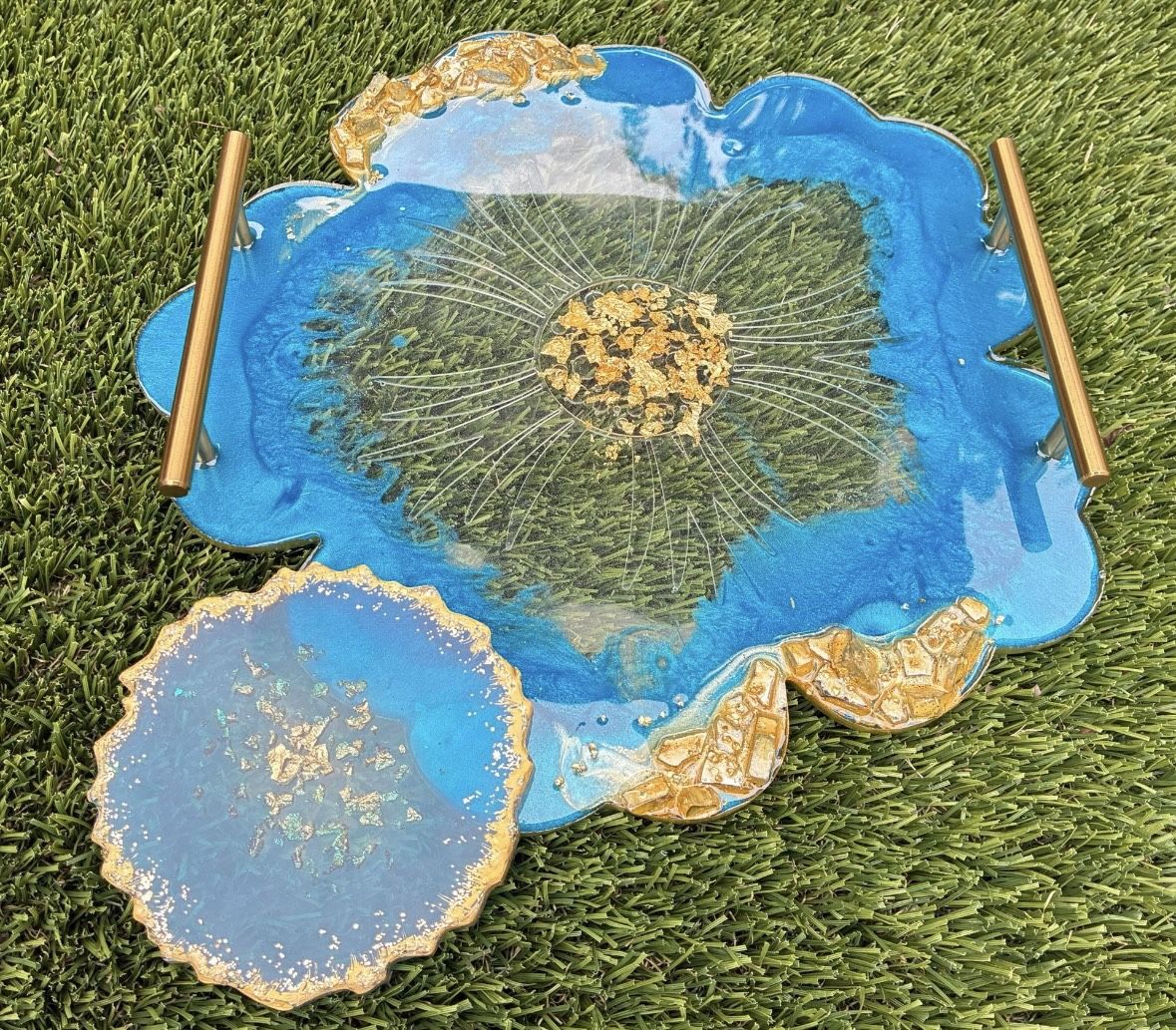 Large Floral Resin Tray Set – Blue & Gold Geode-Inspired