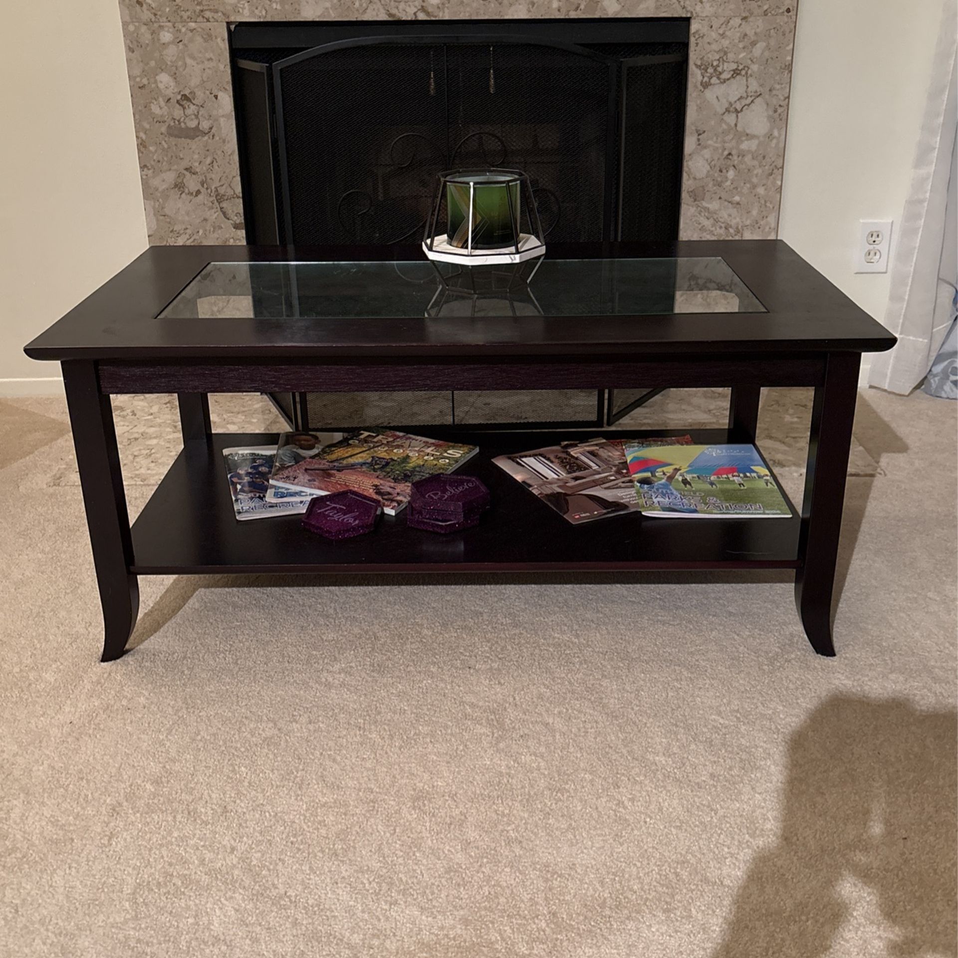 Coffee, brown coffee table with glass insert. Shelf on bottom.