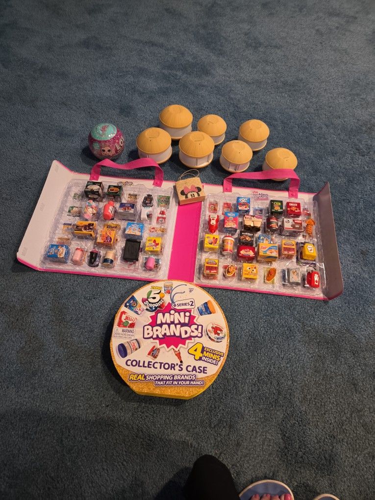 Two collector cases for LOL SURPRISE MINI FOODS. The Big case has most of it Mini Foods in it. The Round Mini Brands Food is collectors case but it is empty. There is ONE UNOPENED LOL SURPRISE BALL $12 in stores. The other LOL SURPRISE BALLS HAVE ALL UNOPENED SURPRISES INSIDE EACH BALL BUT OUTSIDE WRAPPERS WERE TAKEN OFF. THEY ARE NEW. Also included is Mini Shopping Carts, Shelves, Storage Etc. Look at all the pictures I've included.