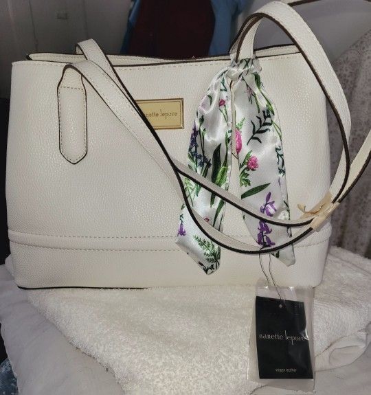 Nanette Lepore White Vegan Leather Shoulder Bag (NEW) with Decorative Scarf Detail