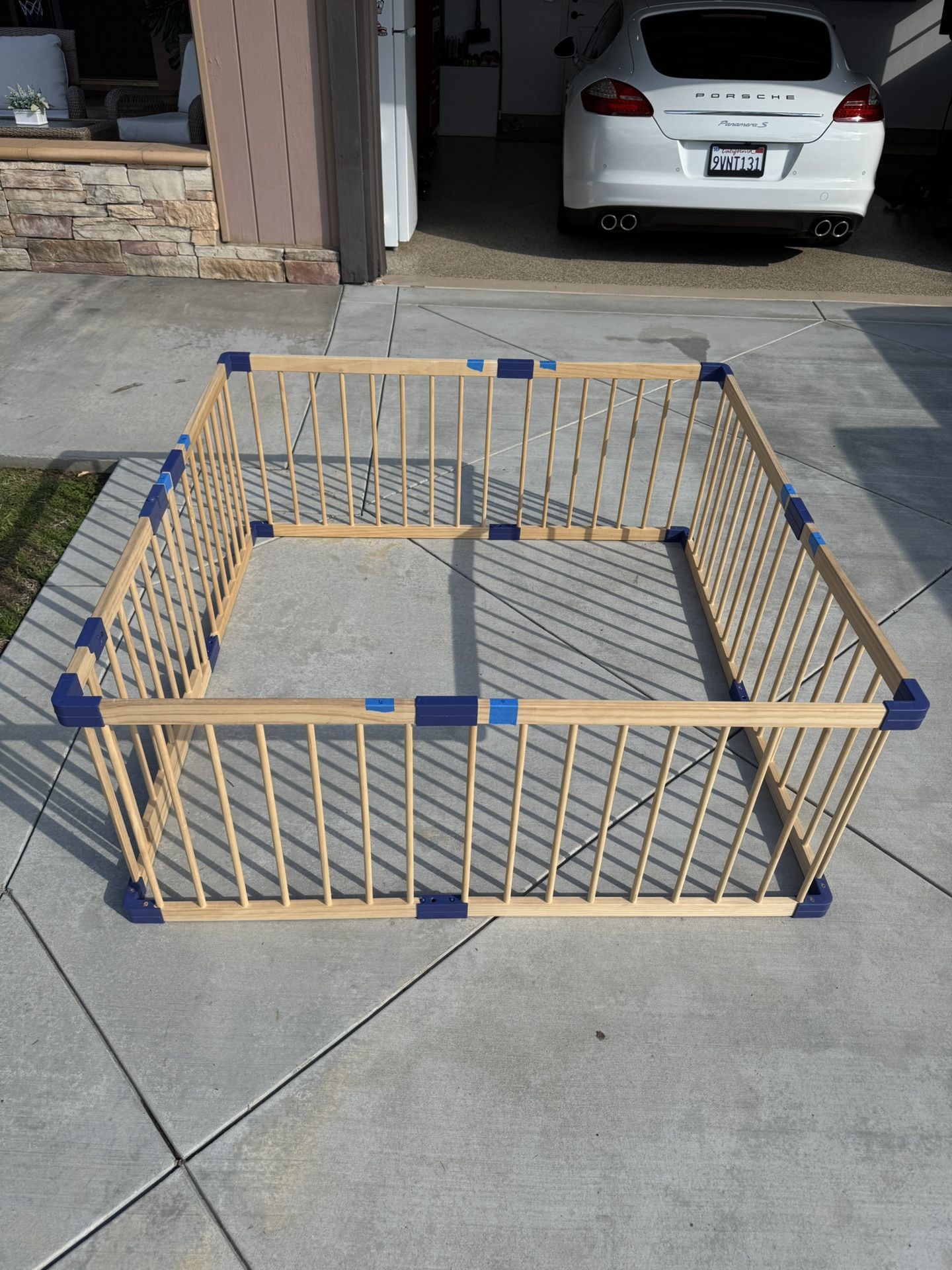 Really nice condition wooden play pin. Hardly used. Has door with locking clasp. Breaks apart easily. Local pickup only. Measures 57” x 57”