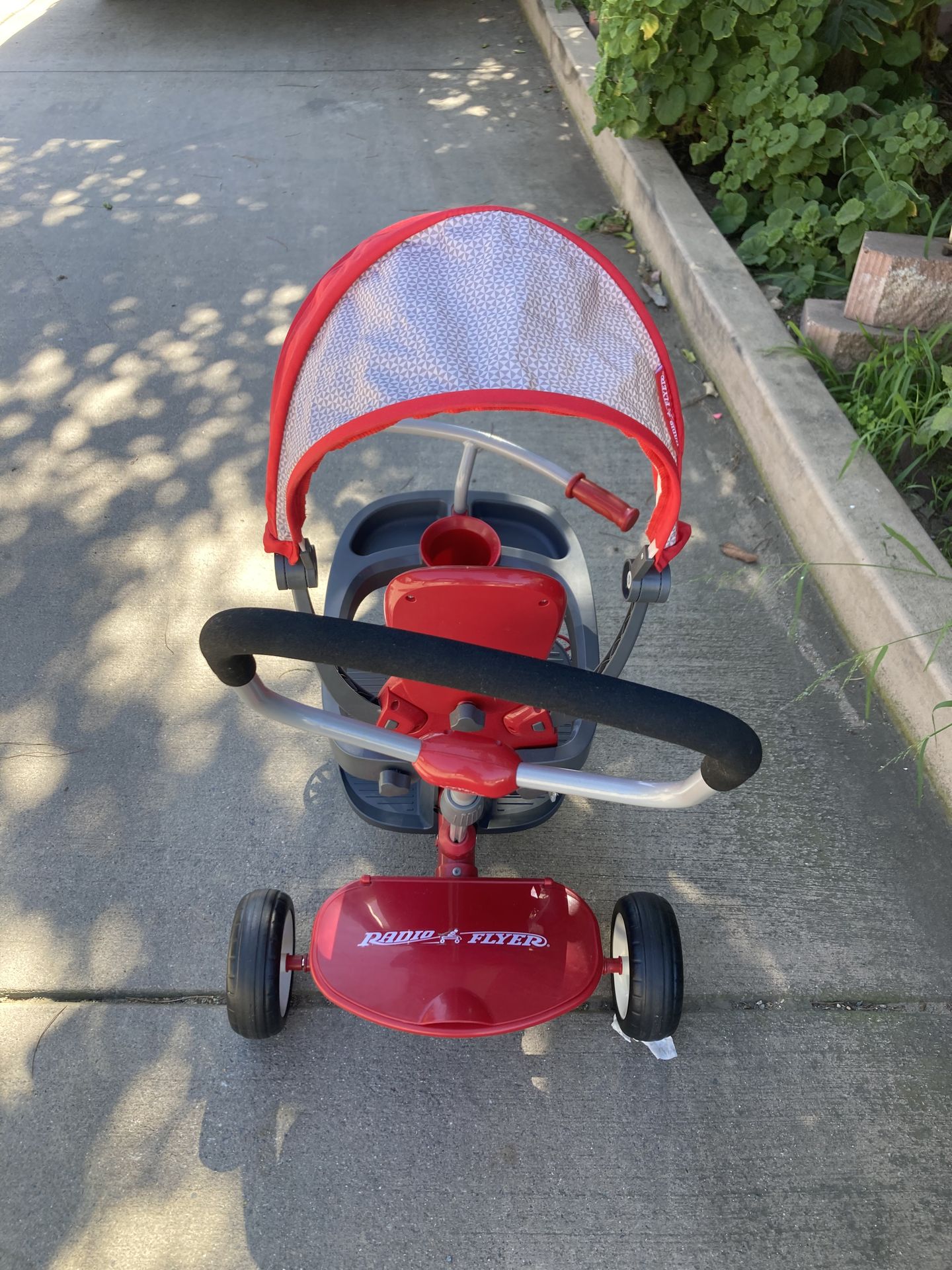Like new 4-in-1 Stroll ‘N Trike® is the ultimate grow-with-me trike that offers 4 ways to ride. It easily converts from an infant trike to a steering trike, learn-to-ride-trike, and finally a classic trike. The trike features removable wrap around tray with cup holder, wider adjustable UV blocking canopy, and a 3-point harness for safety.
