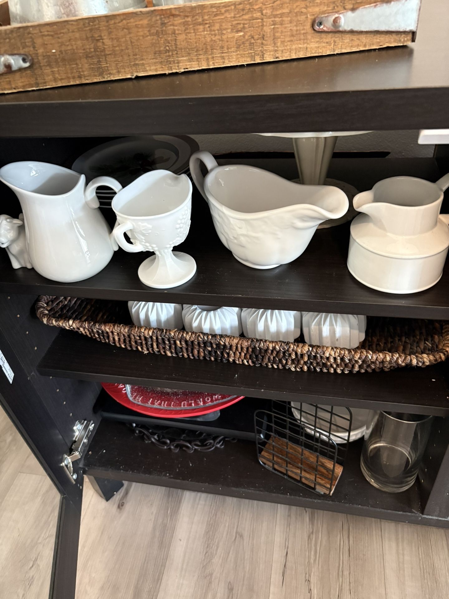 Collection of white ceramic serving pieces, various style styles, plates, gravy, bowls, serving dishes. Willing to sell full collection or individually.