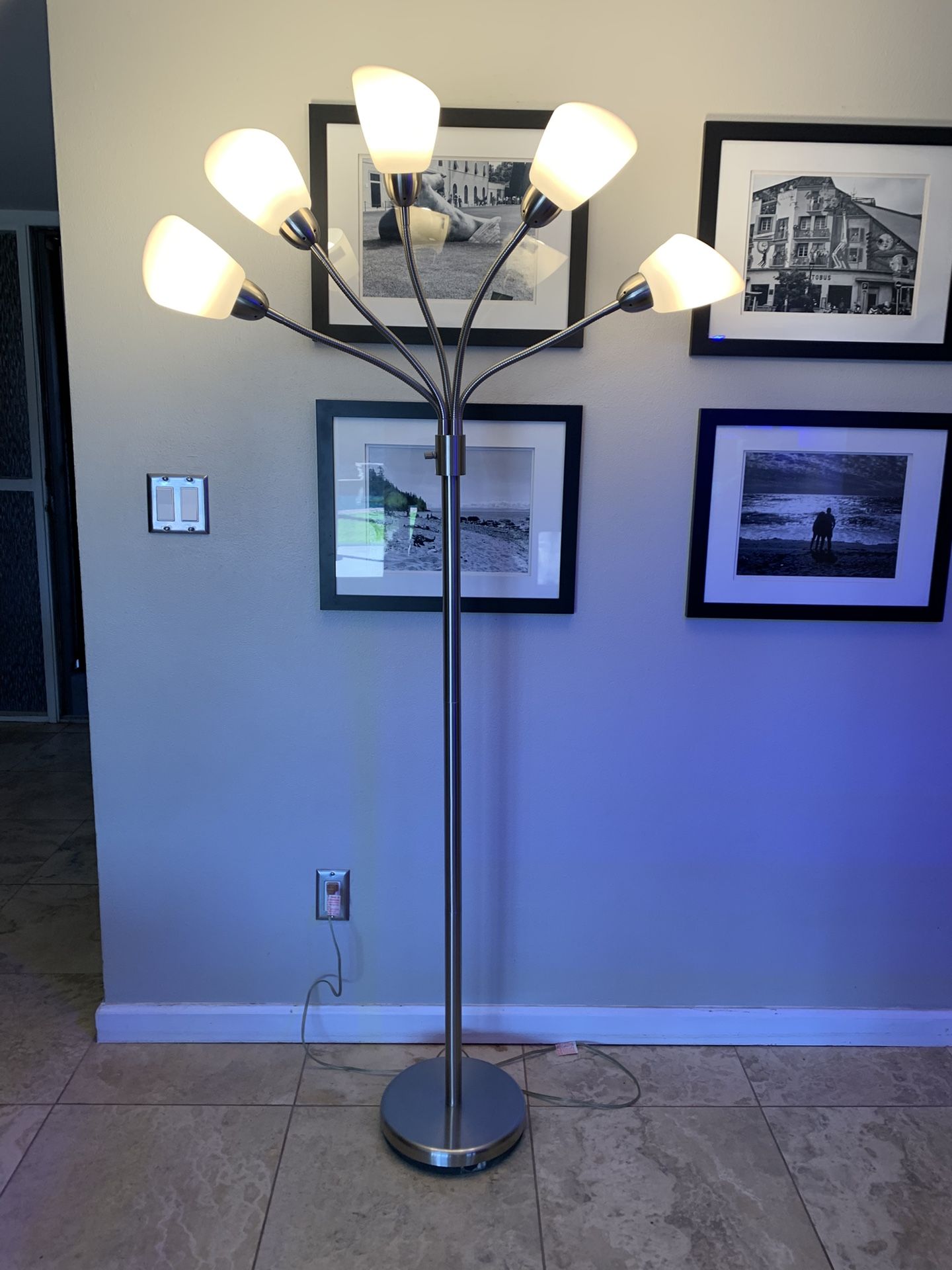 Floor Lamp with Silver Metal base. 5 arms are flexible and can be positioned up, down or sideways. Has 3 settings to control the number of lights you want to turn on. Takes5-60w bulbs. 70 inches tall. Works great. Pick up only. Northwest side of Tucson. No trades.