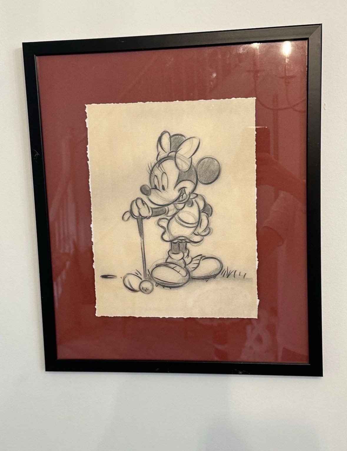 Previously Owned This beautiful drawing of Minnie Mouse enjoying a day of golf is sure to delight any Disney fan. The piece features exquisite details, including Minnie's signature bow and the colorful golf course in the background. Matted and framed in a stunning 16"x20" frame, this piece will make a wonderful addition to any collection or a thoughtful gift for a loved one. The artist's use of pencil on high-quality paper creates a smooth, velvety texture that brings the image to life. Don't miss your chance to own this one-of-a-kind piece of art!