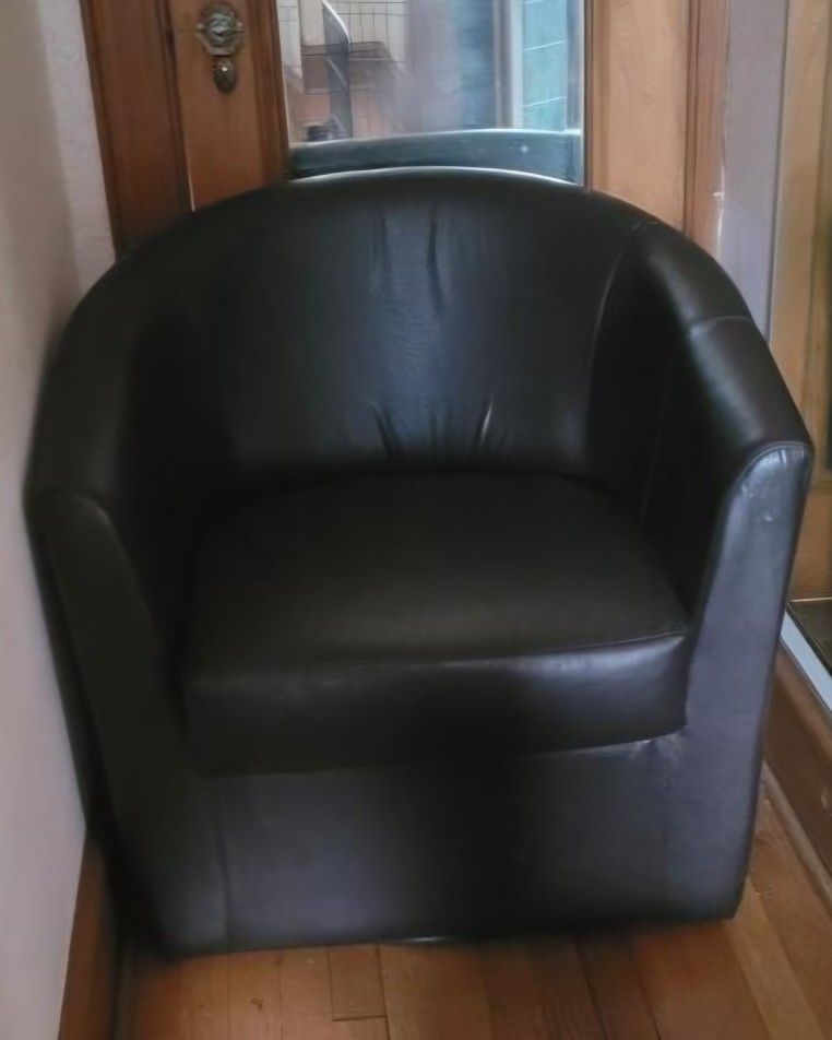 Black leather chair. No scratches or damage. This chair spins .