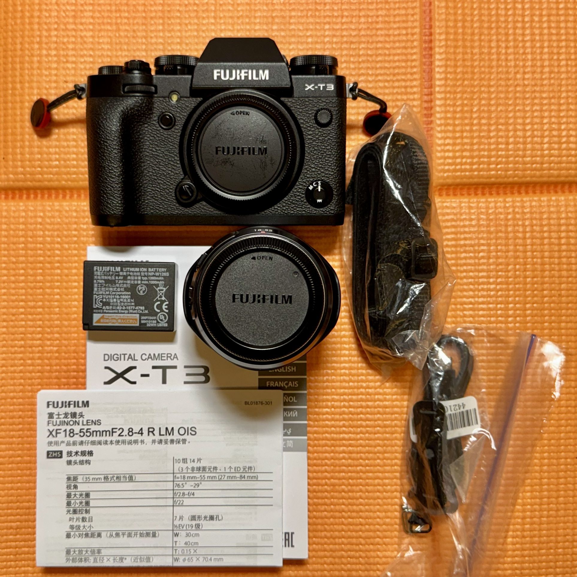 —FUJIFILM X-T3 Mirrorless Camera body with all accessories: -Fuji NP-W126S Li-Ion Battery Pack - Body Cap for FUJIFILM X-Mount Cameras - Original Shoulder Strap - Strap Clips - Protective Covers - Hot Shoe Cover - Vertical Grip Connector Cover - Input Connector Cover —Fuji XF 18-55mm f/2.8-4 R LM OIS Lens with original lens caps and hood —Fuji BC-W126S Battery Charger with 2-Prong USA Plug Adapter (Currently installed Peak Design strap anchors NOT included)