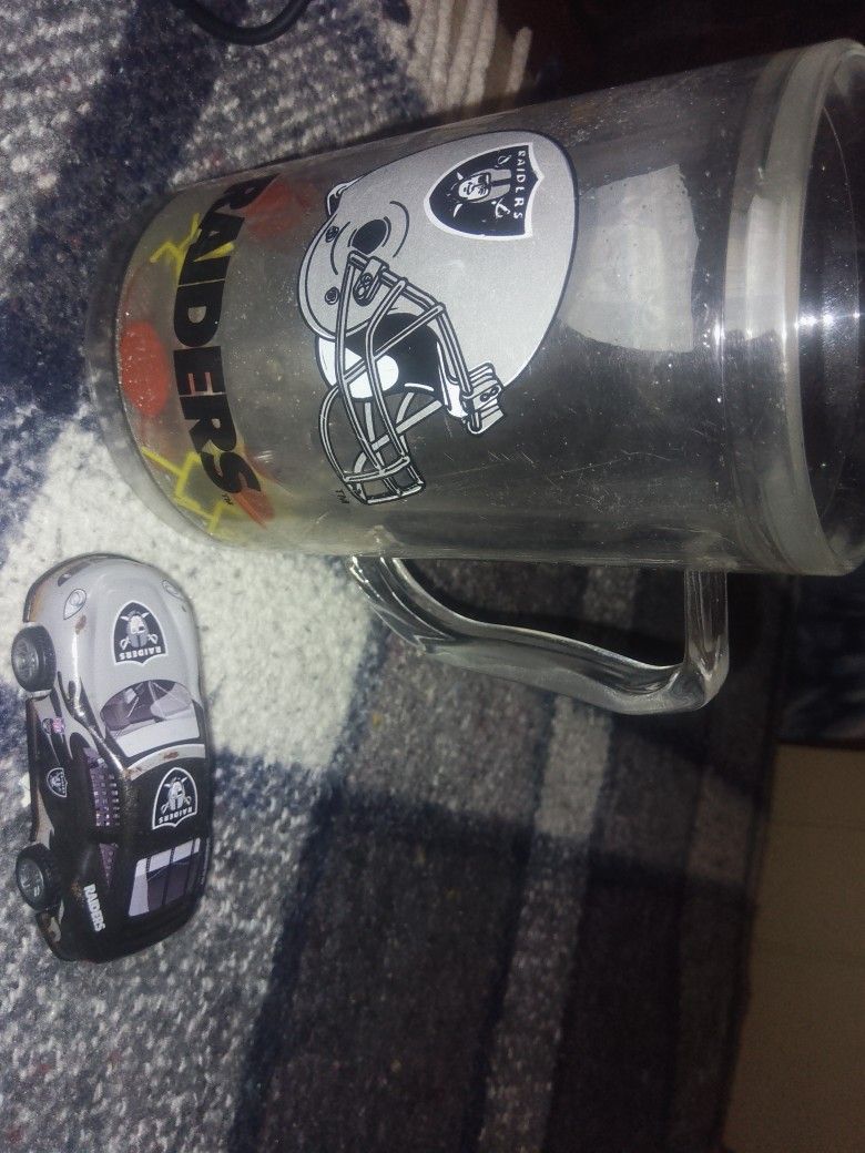 Vintage Oakland Raiders Duck House brand mug has liquid & glitter inside its a bit chipped shown on last photos also comes with a small vintage toy car take both for 5$ pickup in Tulare