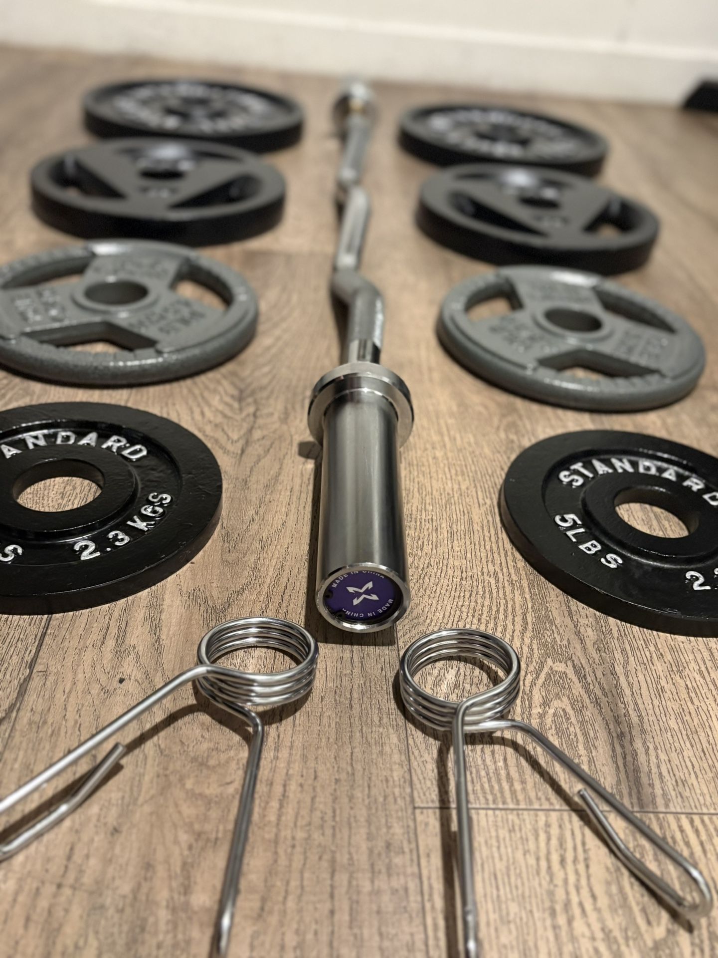 [NO BETTER PRICE…THIS IS IT] The Curl Bar just comes out of its cardboard tube for the pics; the cooper bearings help to make smooth the movement of the weight plates; Beautiful and heavy. The Cast Iron Plates are in NEW & Reconditioned ( not used ones). Excellent equipment. (2) plates 35 lbs (2) plates 25 lbs (2) plates 10 lbs (2) plates 5 lbs (1) Curl bar 20 lbs (2) Spring clips Total: 170 lbs