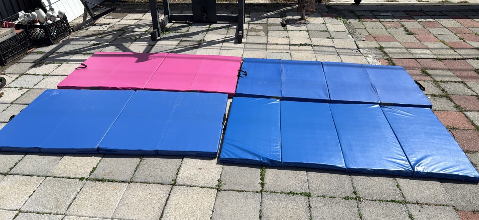 3 workout mats used only twice. There are Velcro straps on the corners to keep them tight together. Each one is 3 x 6 x 2 In this format, it totals up to be 6 x 12 x 2 for extra workout Space. I am selling all three together for $180 or best offer. If you ask, if this is still available, I will report you. If you text and don’t continue on with your offer or follow up with messages, I will report you. Serious buyers only. PINK IS SOLD! 3 blue is remaining.