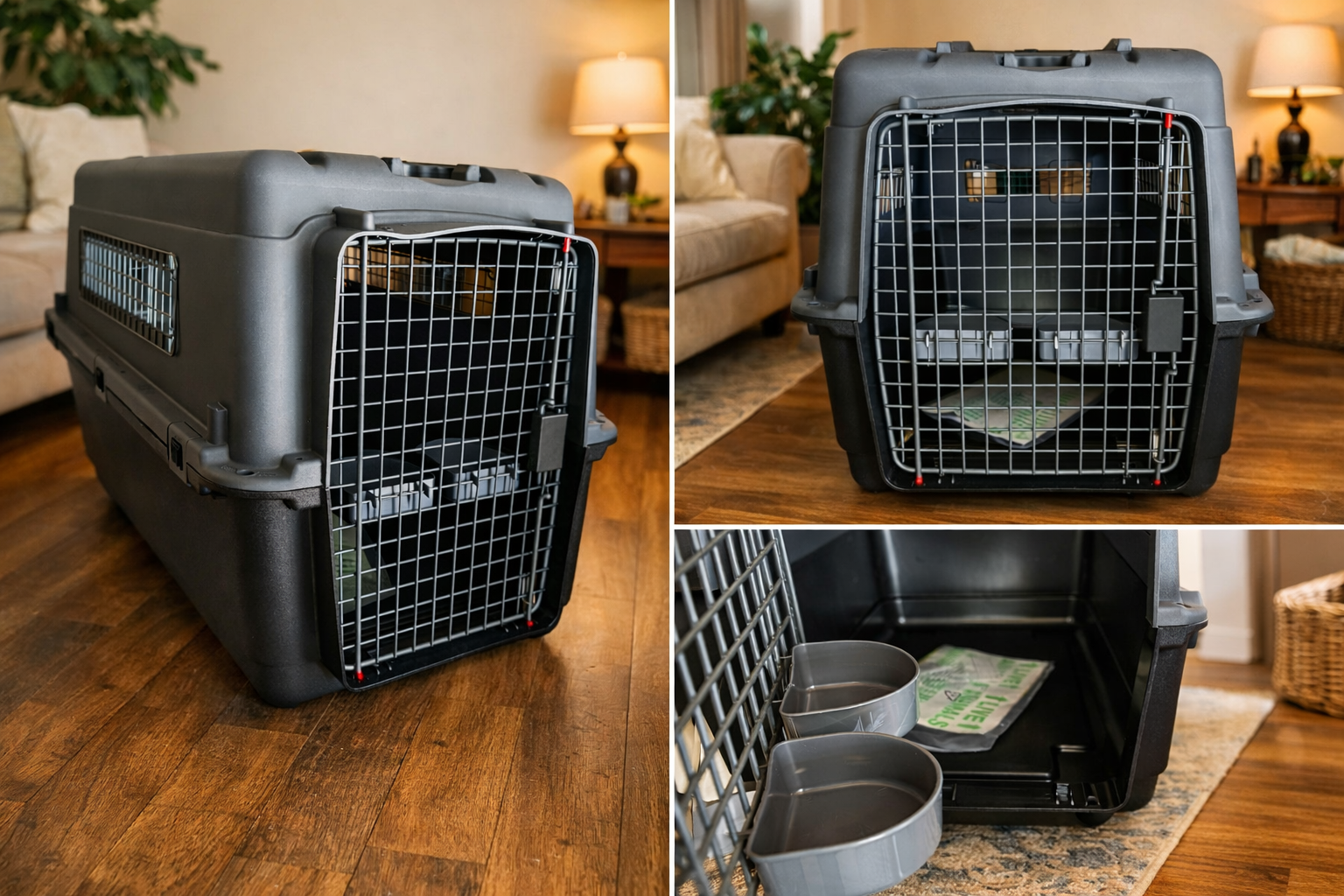 Dog travel cage with airline-approved wire gate, durable plastic with removable wheels, foldable and food bowls Price firm, cash or Zelle Pick up Tempe near Grove parkway and Hardy