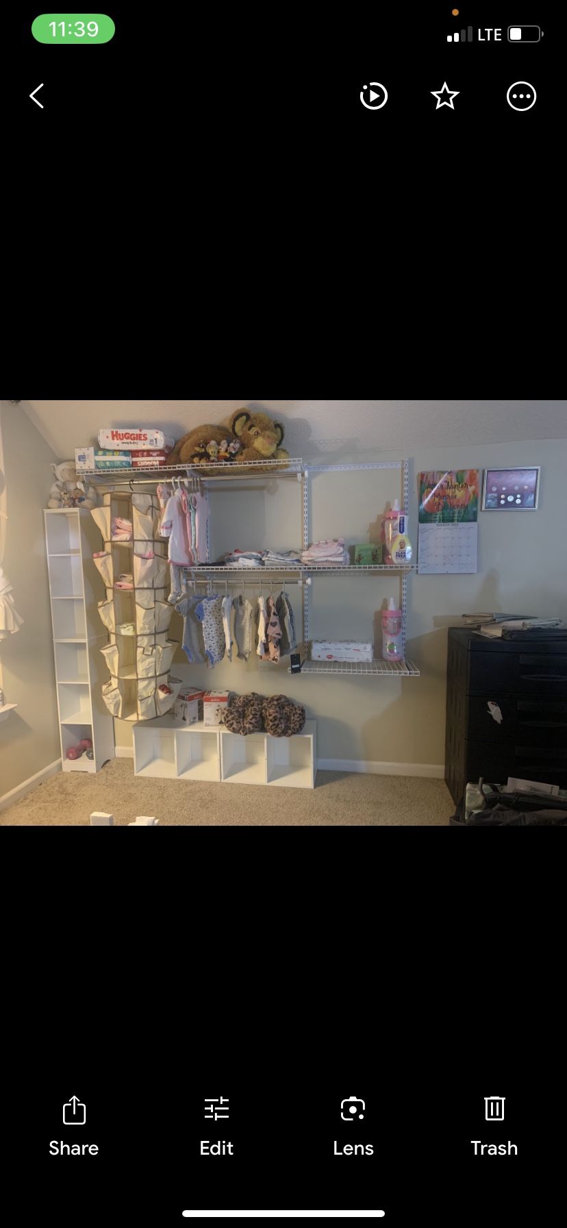This unit is a combination of a wall unit that you can adjust and hang anywhere you’d like in your nursery/room/den. I added 2 white cubbies, one standing up and one flat on the bottom. Also the extra hanging storage that spins. I will sell all together or separate. This was so perfect for my baby girls nursery in the loft because there was no closet space.
