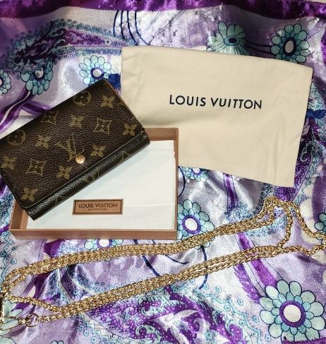 Beautiful authentic LV Monogram Tresor wallet. Box, dust bag, and Cerificate of Authenticity included. Freshly hydrated leather No fading of the monogram. After market chain to wear as a WoC. (Wallet on chain) Would make a beautiful gift for her! Finding this model in this specific condition is extremely rare. If you collect luxury, this is a staple to your collection. If you are thinking of her, YES! SHE WILL LOVE IT!!! This wallet has one single callout, which is so small and insignificant that you will not notice it. It is pictured, and its a just a tiny little corner imperfection.