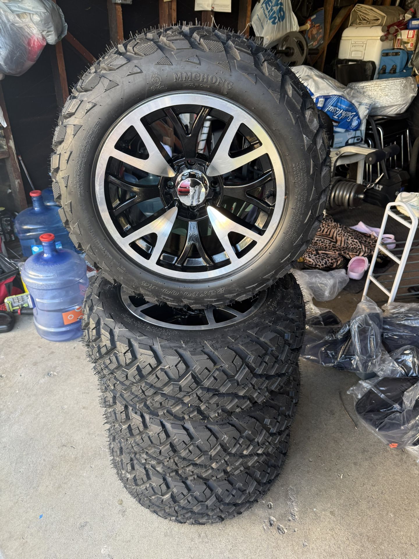 Selling a set of new wheels for a golf cart. Tires are 32x10-14. And the teko rims are 8x14-7.5