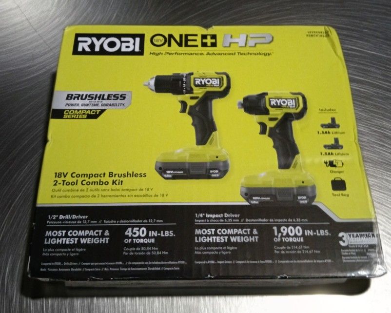 New in sealed box Ryobi 18V ONE+ HP compact brushless 2-tool combo kit. Includes 1/2" drill/driver, 1/4" impact driver, two 1.5Ah batteries, charger, and tool bag.