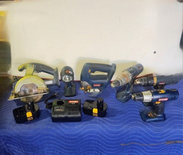 All in working condition. Includes Circular Saw, Jigsaw, 3 speed drill, Flashlight ( needs bulb ) 2 - 2 speed drills, Charger and 2 batteries