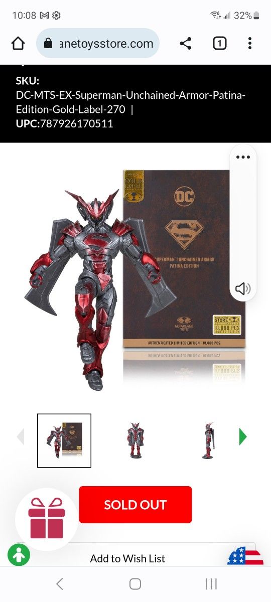 This is an unopened mint condition Superman Unchained Armor (patina edition) figure. This is a Mcfarlane Toys Store Gold Label (exlusive to a certain store), limited to 10,000, and sold out. See other listings as well.