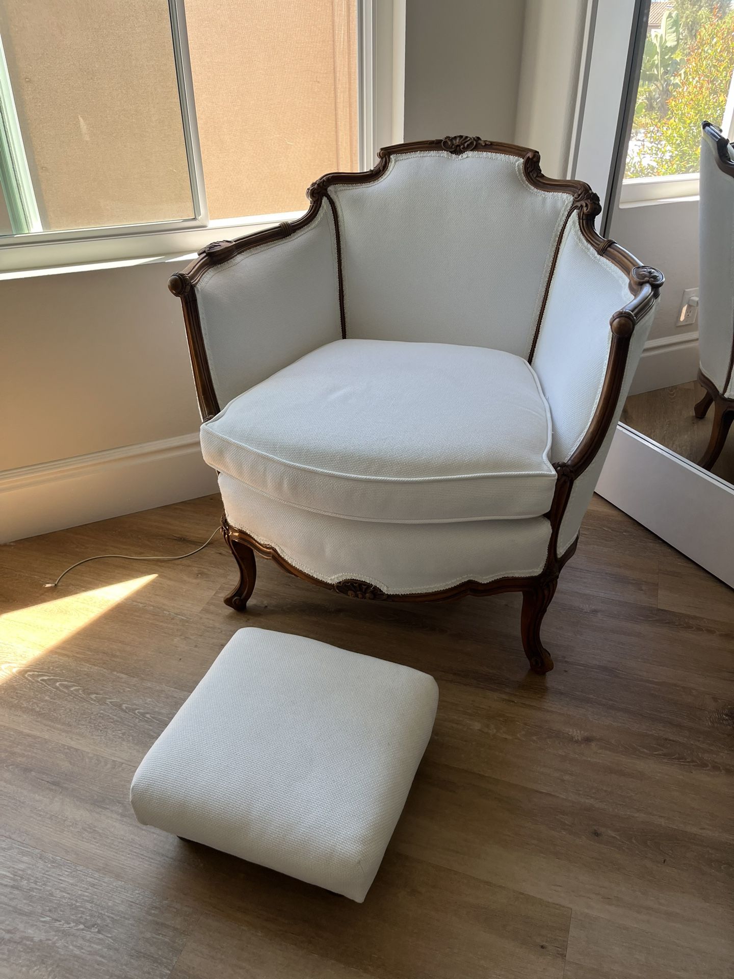 35” by 25 “by 23.5” deep. White fabric chair with ornate wood. Pickup in Laguna Hills.