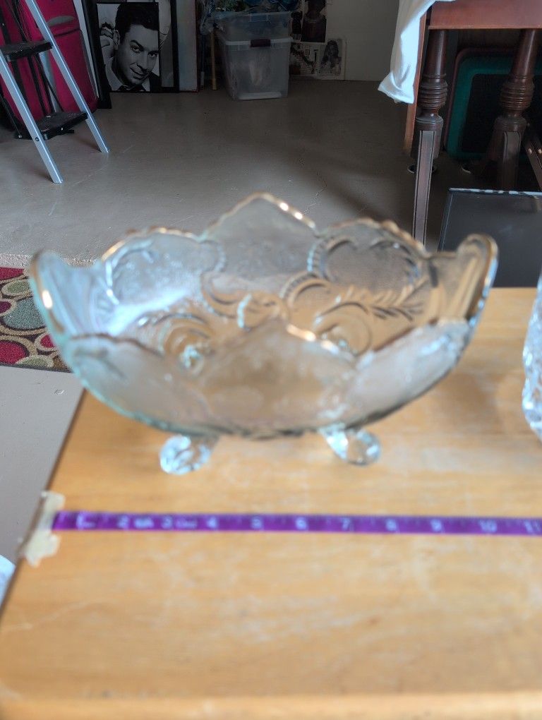 This is a vintage Jeannette Glass Lombardi clear footed oval bowl with a floral pattern and gold leaf edging.