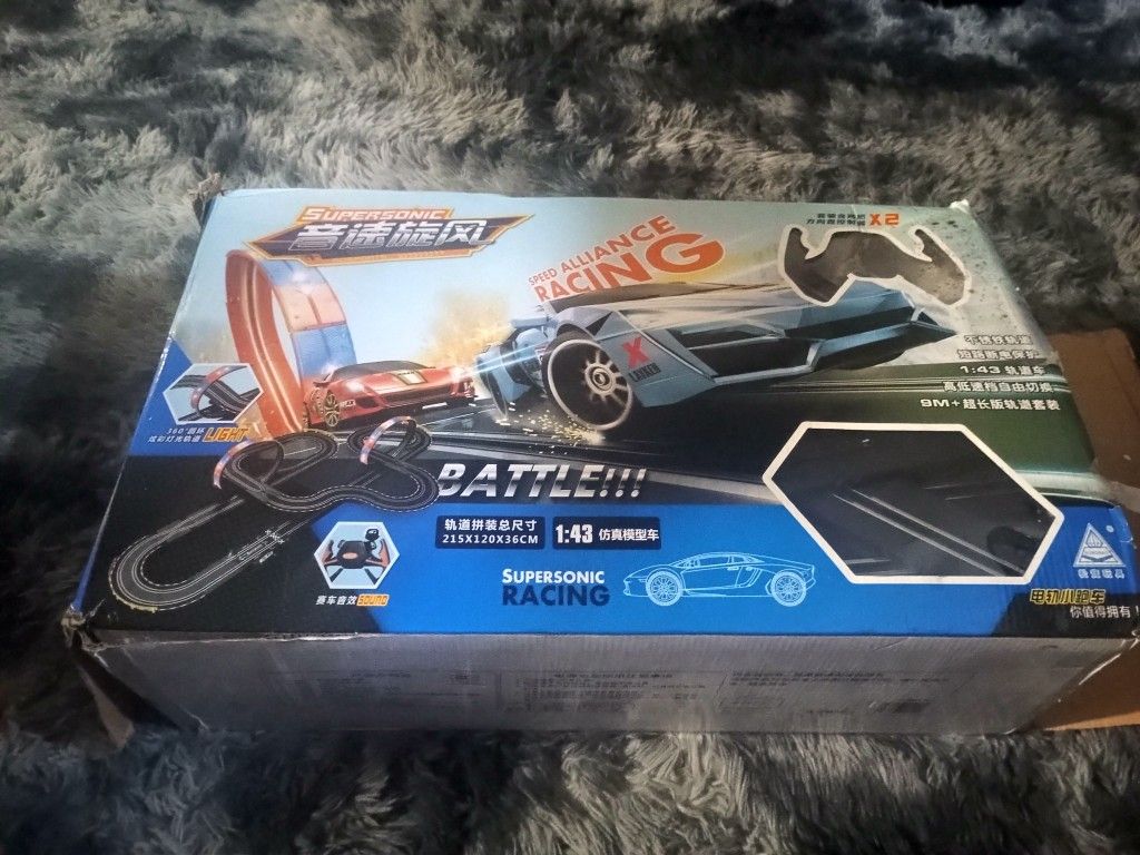 Super sonic battle race track. Everything. Is in the box my kids had fun with it they just don't play with it no more nothing wrong with it