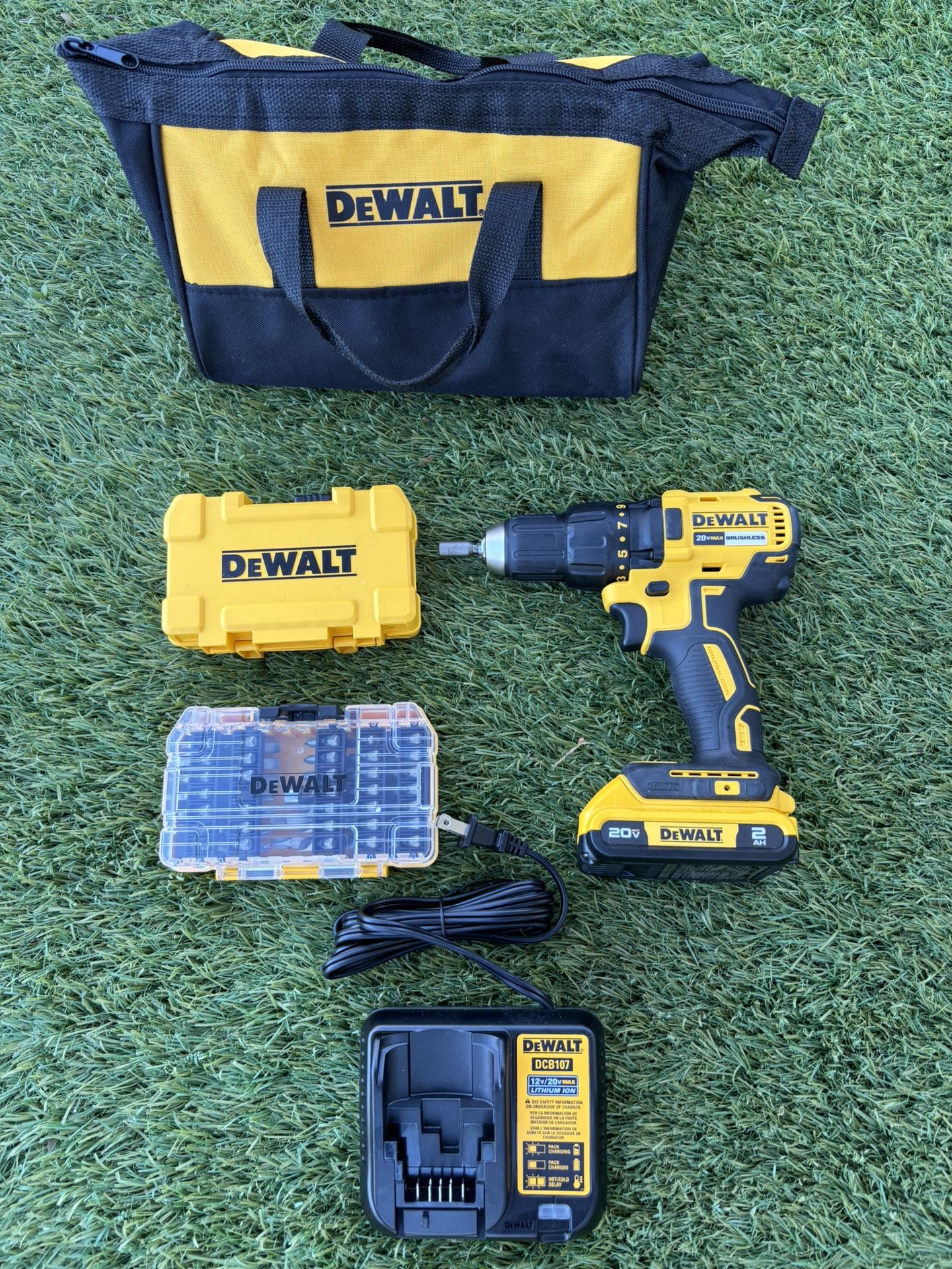 Up for grabs Dewalt power brushless drill/driver set comes w contractor bag Used very few times Like-new conditions Works perfectly Sales in store for $192 $140 DCD794D1: Unlock power in a compact size with the ATOMIC COMPACT SERIES 20V MAX 1/2 in. Drill/Driver. Get up to 16% more power for a variety of drilling applications in tight spaces with our shortest 20V MAX Drill/Driver (tool head length only). The LED work light illuminates small spaces to optimize productivity on the job site. DWAUMF30SET: Featuring an ANTI-SNAP design, MAX FIT ULTRA screwdriving bits are reengineered to deliver up to 800 more screws per bit on select SKUs. These improved screwdriving accessories also offer precision fitment for accurate driving. MAX FIT ULTRA screwdriving accessories are built to last and can handle rigorous applications. Includes: DCD794D1 and DWAUMF30SET.