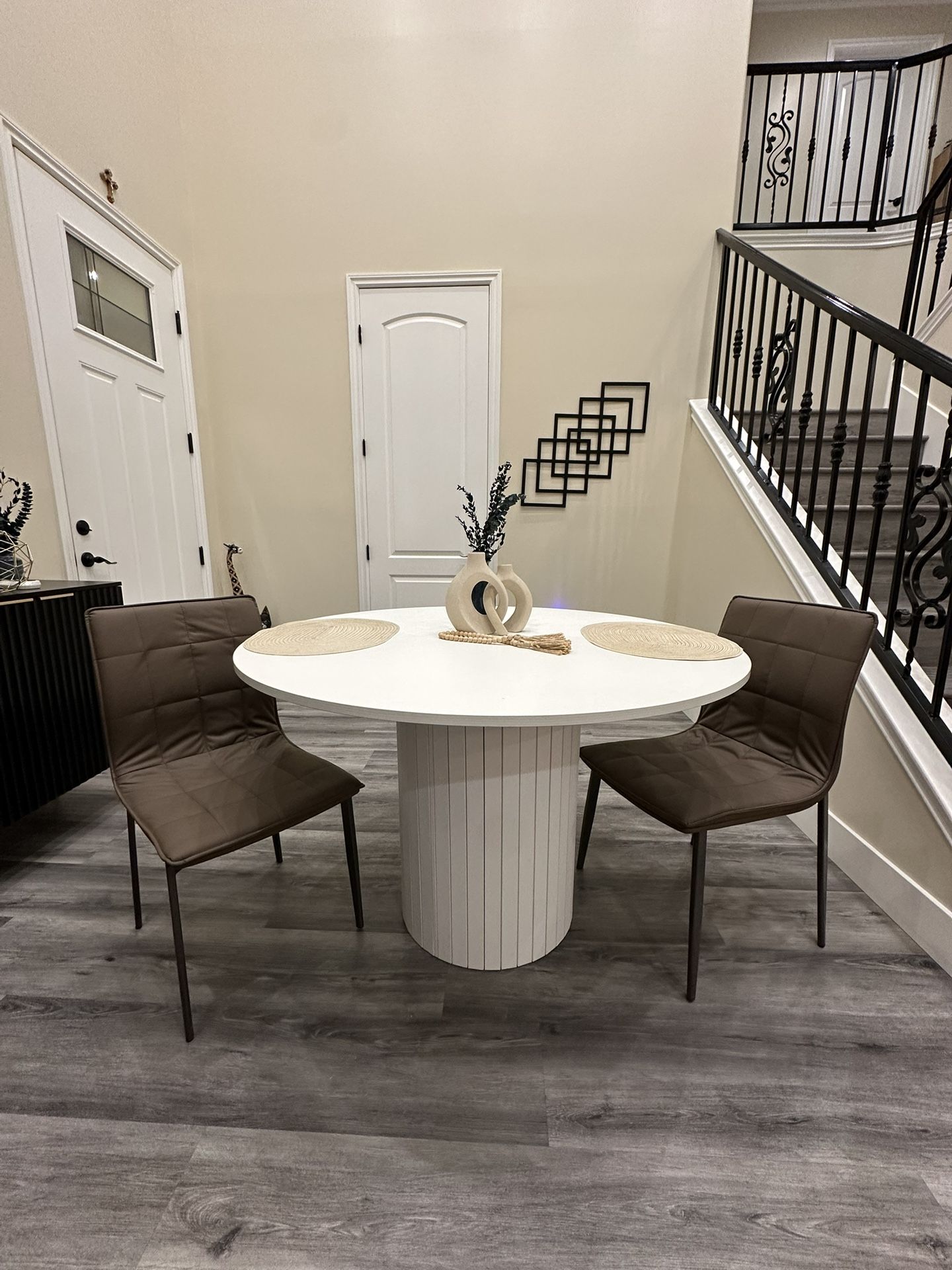 Beautiful custom handmade round dining table with a modern pedestal base. Clean, neutral design. ✨ Details: • Custom built (not store-bought) • Solid, sturdy construction • Modern fluted pedestal base • Smooth white tabletop • Includes 2 brand new open-box dining chairs • Chairs are comfortable, modern, and neutral Condition: New Asking price $1,150 or better offer No return
