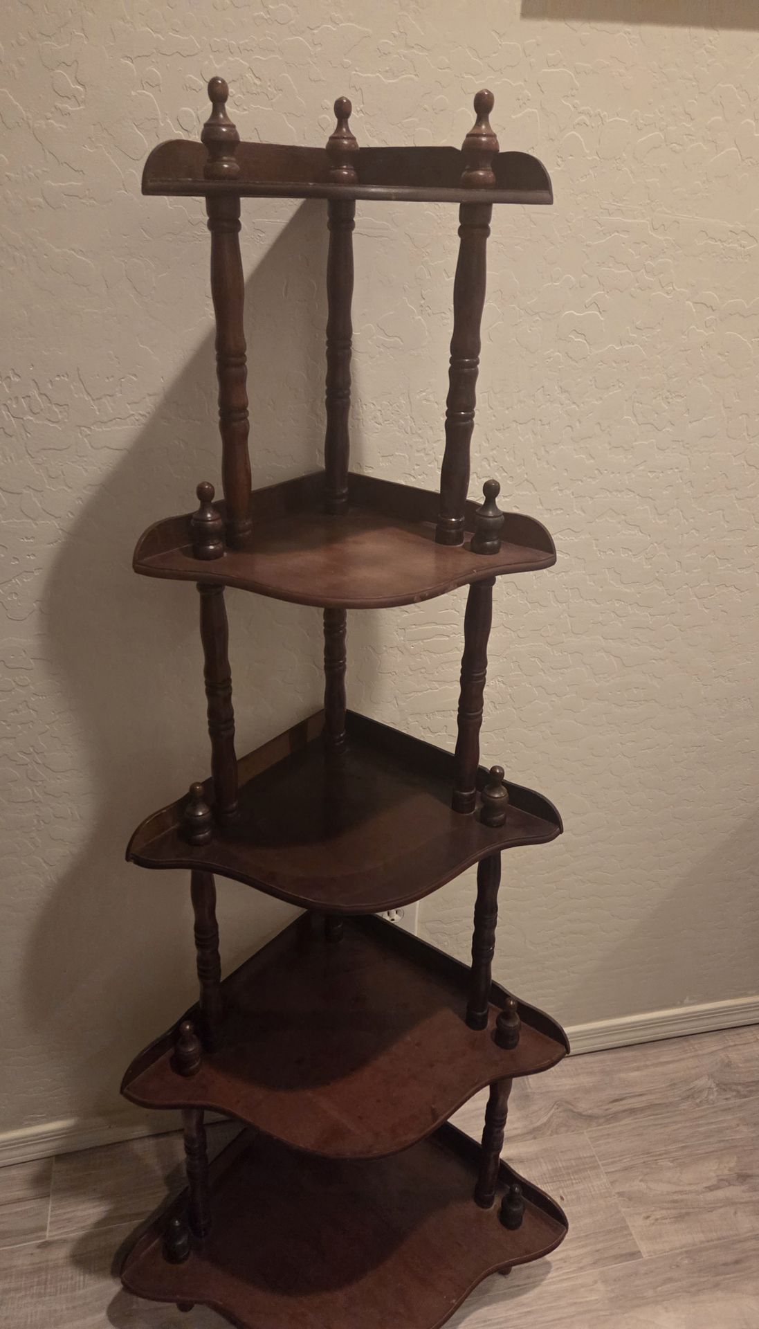 vintage 5-tier corner shelf is constructed from turned wood and features Victorian-style stick-and-ball detailing, commonly referred to as a "whatnot" shelf.