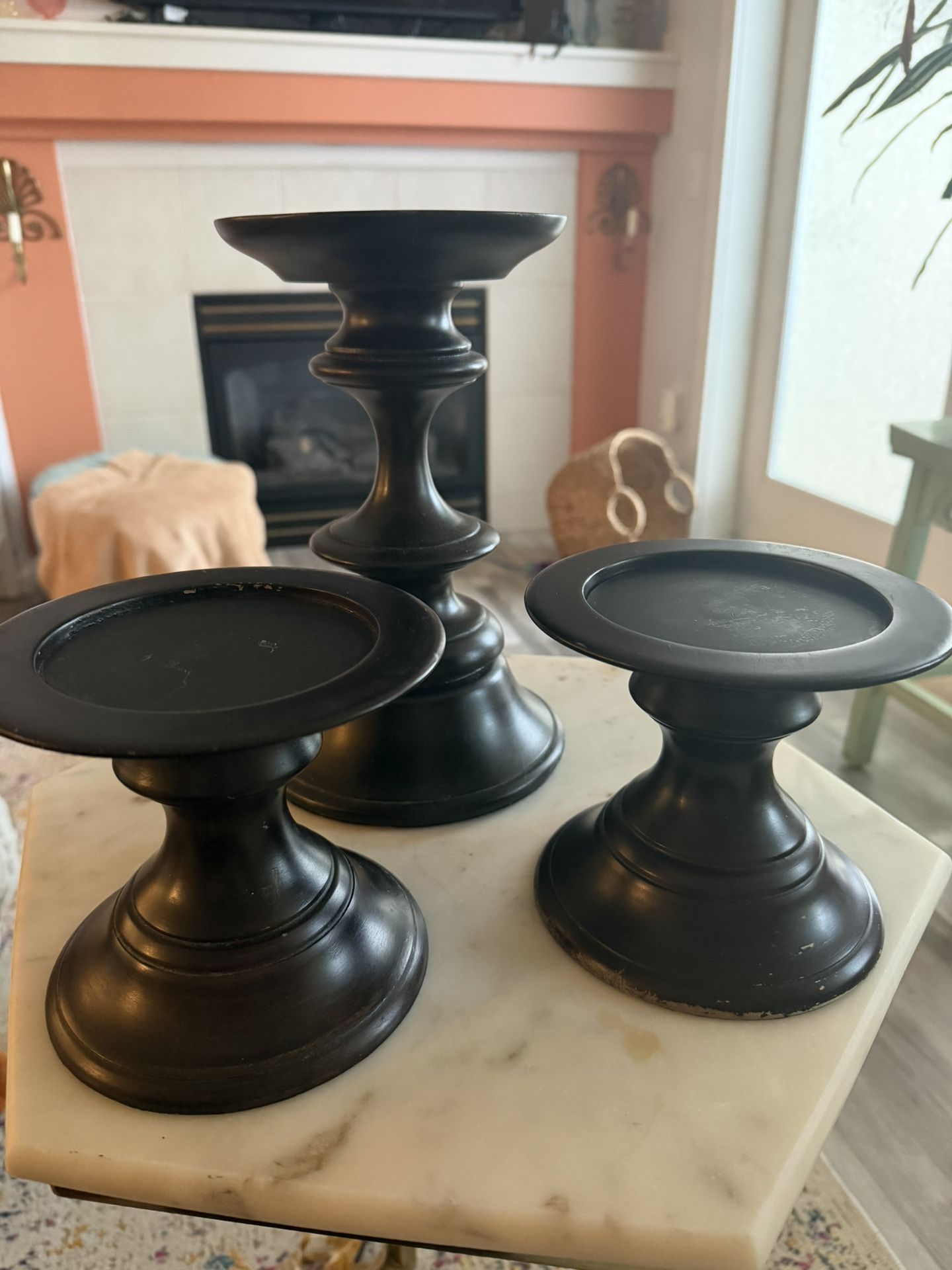 Three wooden pillar candle holders, dark mahogany brown color. Small ones have some scuffing near the bottom (pictured) that can easily be retouched.