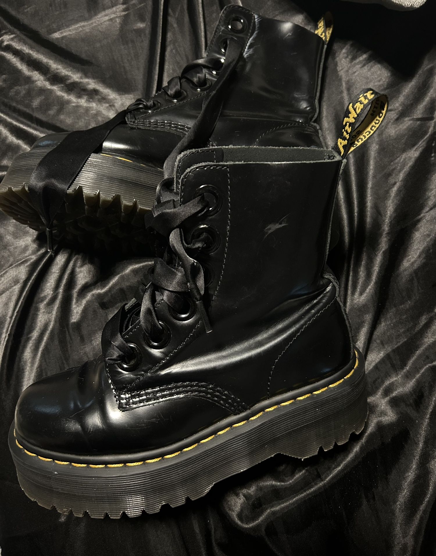 Size 6 black shiny leather with ribbon laces. Bought them for $179 about 6 months ago.