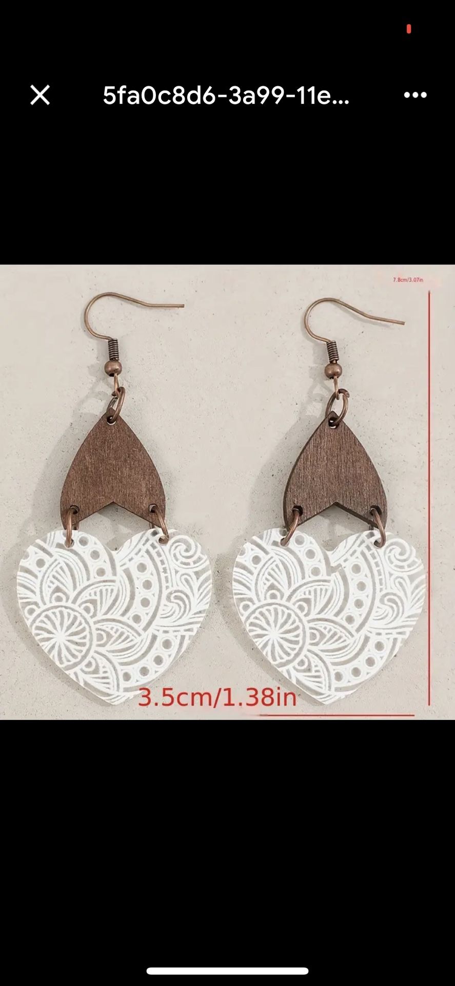 Lightweight handmade earrings with natural wood and white carved heart details. Length: 7.8 cm.