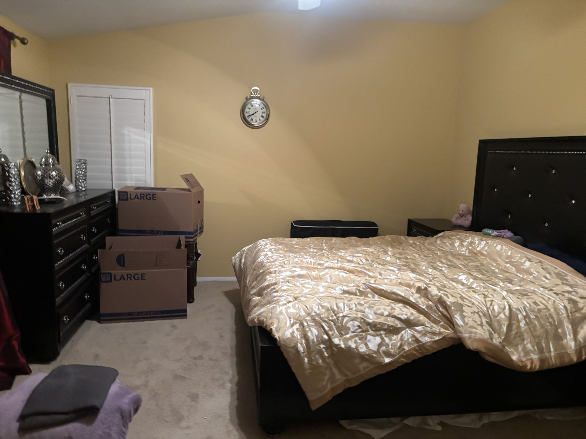 1 cal king bed frame with mattress 2 nightstands 1 dresser with vanity mirror. All included Must pick up and take apart (bed frame)