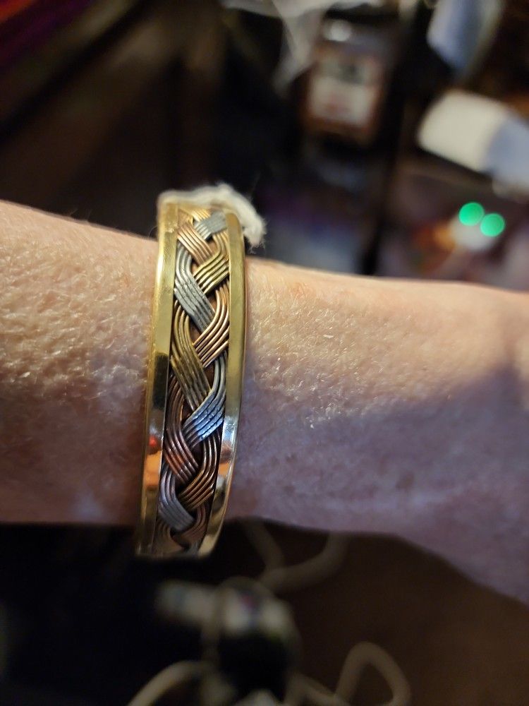 Might be a Renee Lepre was found with a tag. 5" opening multi metal woven silver,copper, and brass. Can be opened and closed carefully to size. From a smoke-free environment and a dog friendly home.