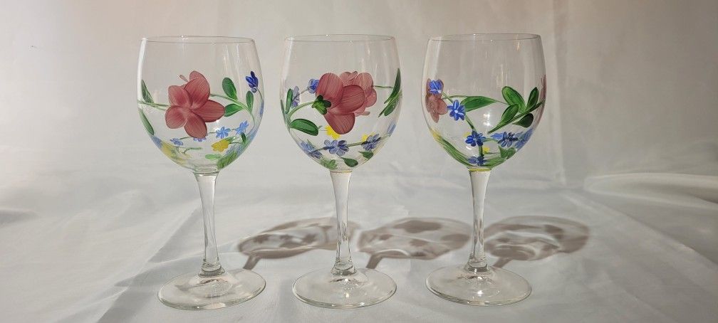 Three glass hand-painted wine glasses with pink blue and yellow florals