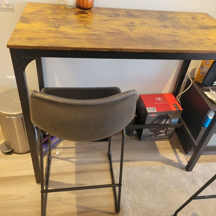 Brown table. 41 inch height. Fits 31 inch stools or higher. Can be disassembled. With 2 bar stools.
