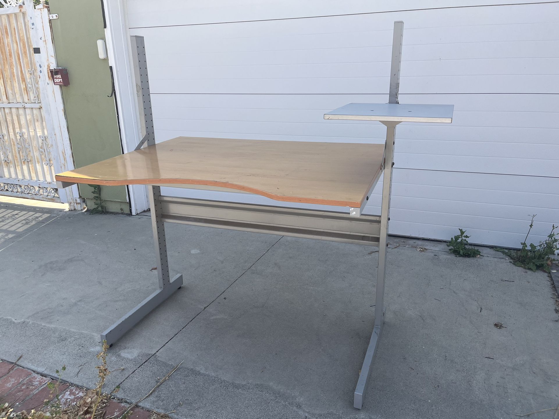 Adjustable height desk with steel frame and swiveling laptop holder/stand. Was used as an art desk so there are some paint spots and the veneer is peeling off the front a bit.