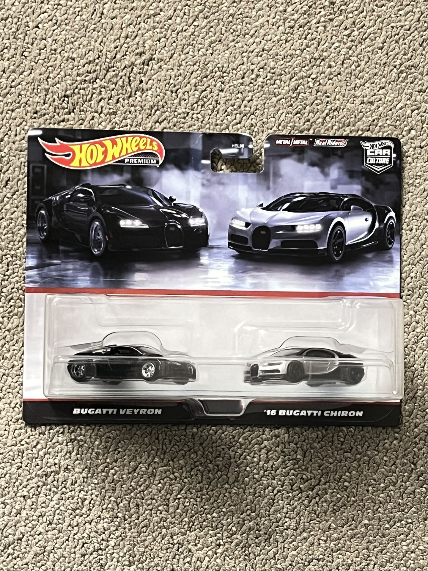 Hot Wheels Premium 2-Pack Bugatti Veyron and Bugatti Chiron Metal/Metal Real Riders Target Exclusive Brand new in box Keywords: two pack, super car, hyper car, exotic car, Car Culture, NIB