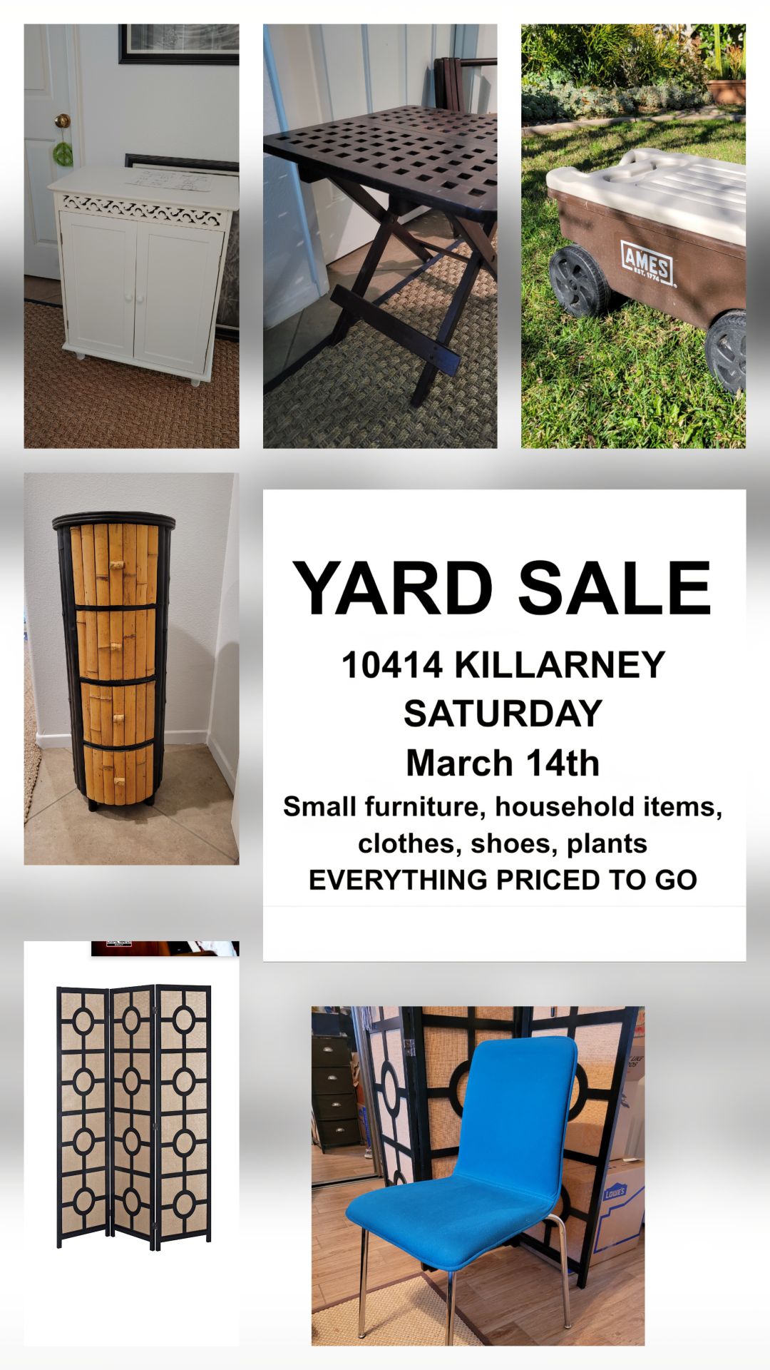 EVERYTHING MUST GO Small furniture, household items, clothes, shoes, plants Free stuff too! 10414 Killarney Dr. Saturday 7AM