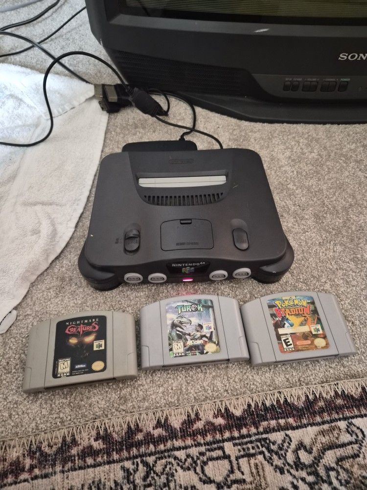 SELLING AS BUNDLE ONLY Included: - N64 (Fair condition, Reset button finicky) - Original AC Adapter - Third-party controller - 3 Games (Pokemon Stadium, Turok, Nightmare Creatures) Not included: - Video Cable Pickup Only, open to trades.