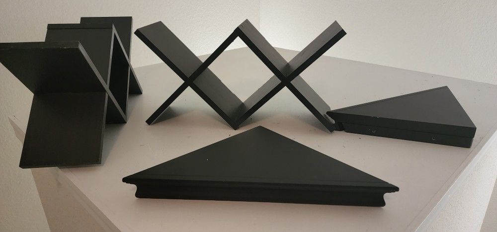 Total of 4 shelves. 2 of each style. One style is for corners Floating style with espresso finish. Mounting hardware not included such as wall anchors or screws. This can be purchased at home depot or any tool store.