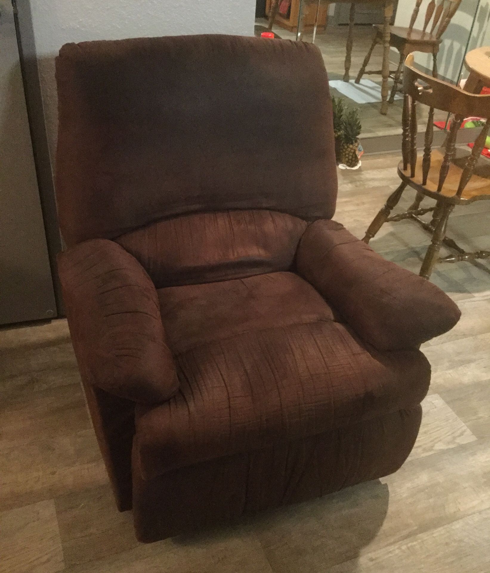 Its a very comfortable recliner chair sold in as is condition. Very sturdy and working perfectly. Pick up only, no shipping or delivery to home. Only the recliner is sold not the pineapple or any other item which is shown in the pic 🤣🤣 .Please grab it as soon as you can.