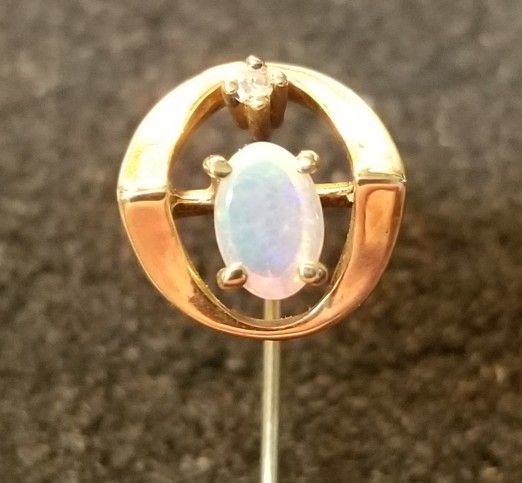 Opal and diamond stick pin. Tests 14kt. Gold. Diamond is approx. 03points, and opal measures approx 6x4.5mm. Entire piece weighs 1.6grams.