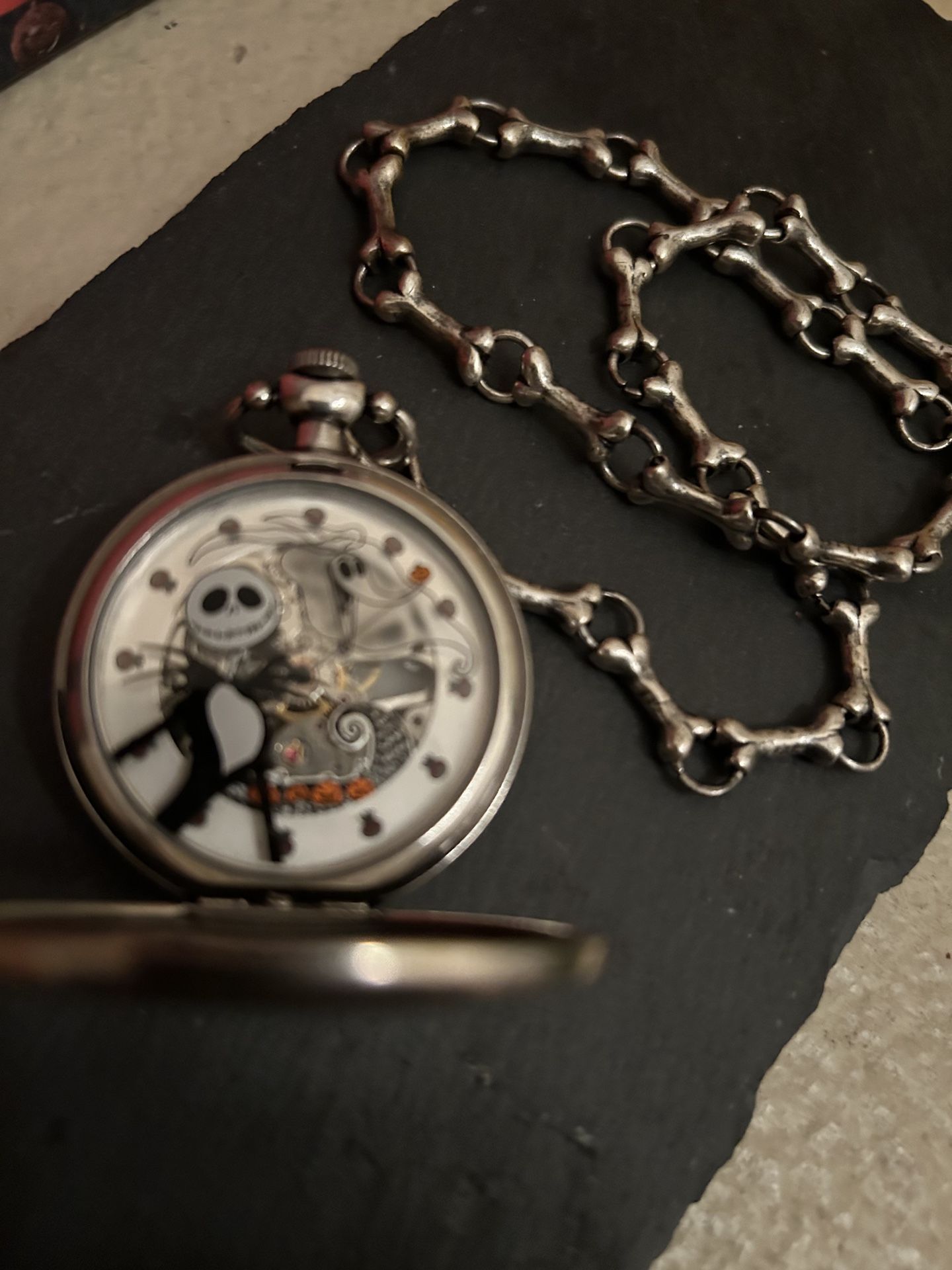 Just in time for Holloween a nice stainless steel pocket watch with Tim Burtons “Nightmare Before Christmas “ Disney touchstone . In great working condition keeps good time.