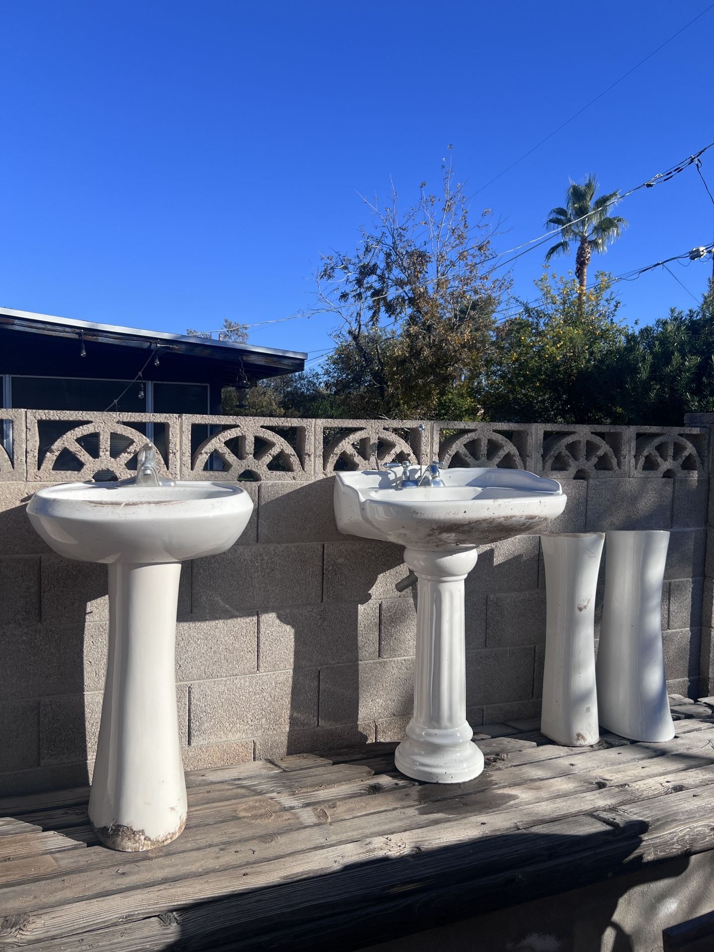 Lot of pedestal sinks. 2 good sinks, 4 good pedestals. The other 2 sinks (not pictured) have cracks but you are more than welcome to take it all for $40. Everything needs a cleaning, but should shine right up