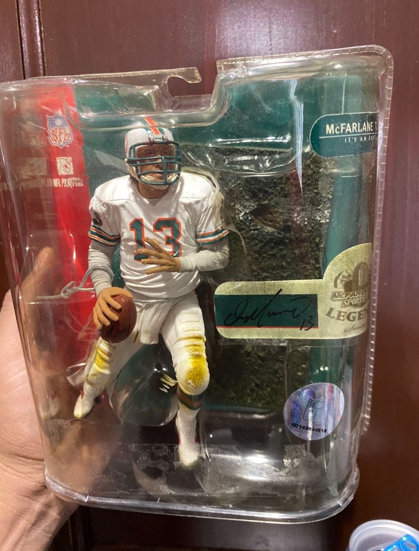 Signed Dan Marino McFarlane Sports figure in original packaging. Marino is in his classic white throwback uniform with the Miami Dolphins (#13). Figure is still sealed in the original clamshell packaging. Packaging shows some light wear/clouding from storage but overall displays well. Signature is clean and clearly visible on the football. Great piece for any Dolphins fan or NFL collector. Made by McFarlane Toys. Serious buyers only. Local pickup preferred. Open to reasonable offers.
