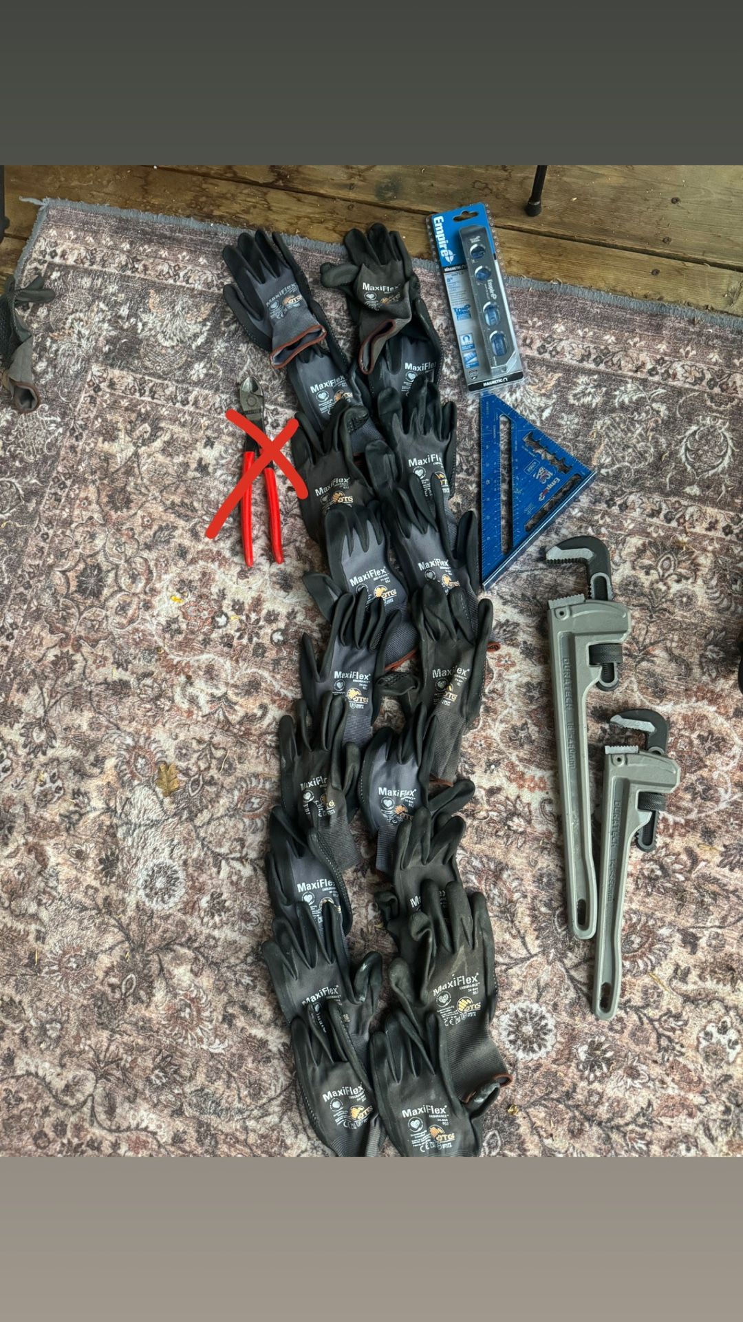 14” pipe wrench 18” pipe wrench, 8 pairs of large maxi flex work gloves mostly brand new. With an empire level shoot me an offer!